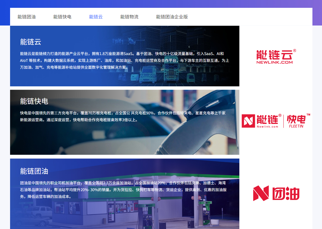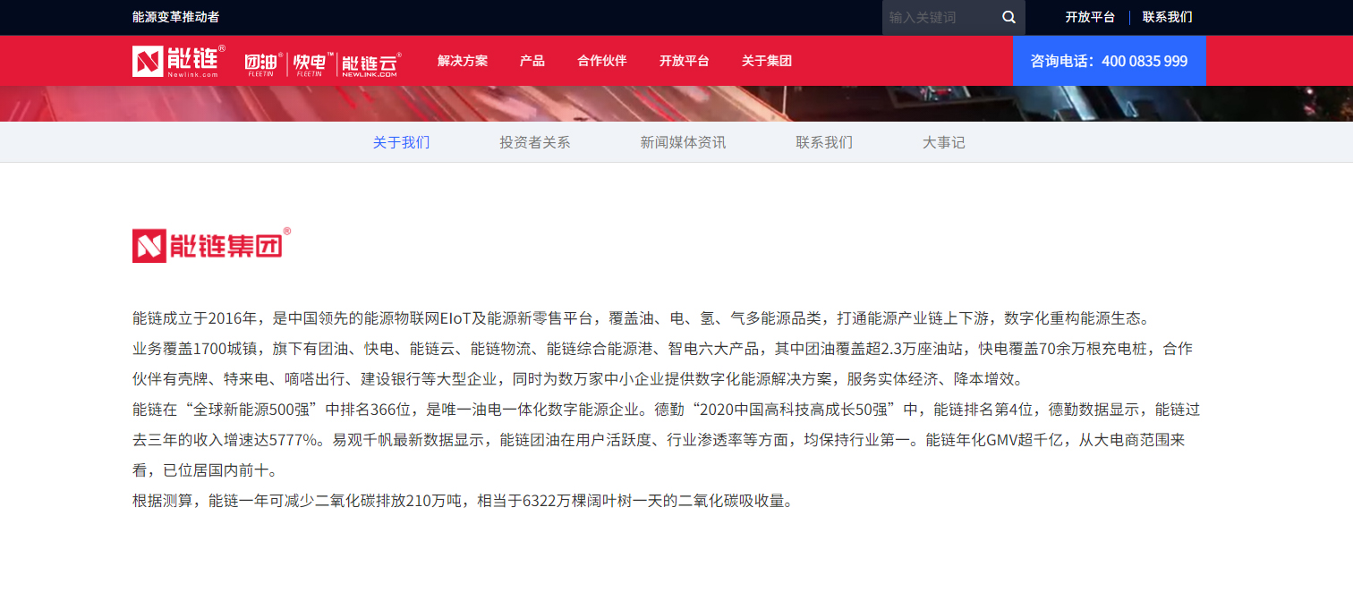 能链NewLink成立于2016年,是中国最早专注于能源数字化的企业之一,年化交易额超1000 亿元人民币,占中国能源零售份额近 3%,是中国增速最快的能源互联网独角兽之一。能链拥有团油、能链智电(NASDAQ:NAAS)、能程科技、能企科技、中能链等业务,服务网络覆盖全国约1800城镇,涵盖油、电、氢、气等多个能源品类。作为领先的能源变革推动者,能链的愿景是“让每个人都用上绿色能源”。能链旗下能链智电(NaaS),总部位于“绿水青山就是金山银山”两山理念的发源地——浙江安吉,公司于2022年6月13日登陆纳斯达克,成为中国充电服务第一股。公司总部的能链智电实验室(NaaS Lab),是集充、换电,无线充电,以及氢燃料电动车和储能于一体的综合性实验室,并且具有国内领先的无人驾驶、机器人充电研发团队。